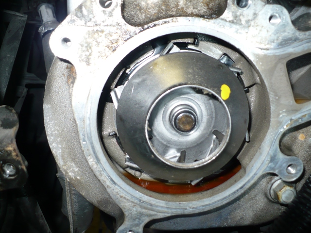 The pump is now installed, no leaks. This one was a major pain to bleed the system, the trick is to fill the system, let it warm up to temp, then turn it off and let it cool to room temp. then you can add another few quarts of fluid and it should be alright. Verify this by driving with the heat on full hot and make sure it stays hot and the temp gauge doesn't move around.