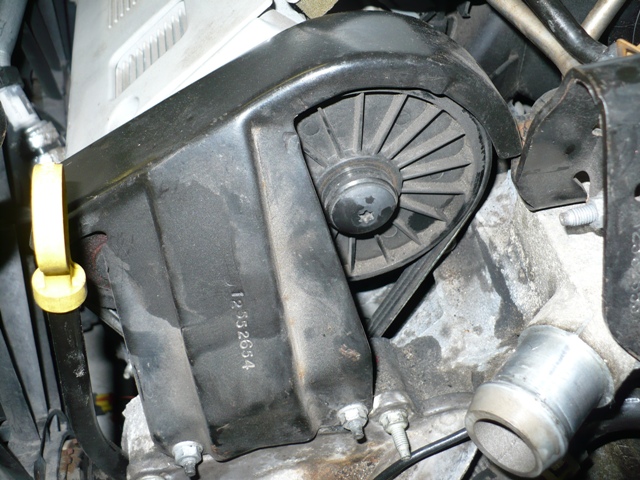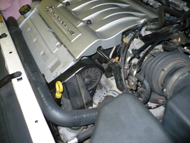 This job is on a 2001 Oldsmobile Aurora with a leaking waterpump. This is the 4.0 liter engine which is basically a Cadillac Northstar 4.6 liter engine with a modified stroke to make it a 4.0 liter. The pump is driven from a pulley at the rear of the front exhaust camshaft. This pump is tabbed to turn into the housing with angled tangs and requires a special tool to remove and install it.
