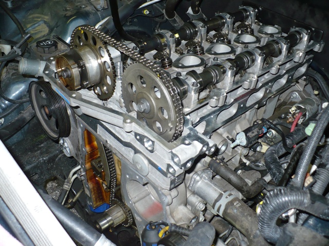 The only problem with these is that when you use the Kent-Moore special tool to hold the timing chain in the lower end, it either slips off the guide from being too loose or hammers the tensioner in causing it to stick in, from being too tight. Adding to this is the fact that the guide that the tool is pushing against to hold the chain, has to be unbolted from the top to remove the head. If it moves at all, the tensioner will ratchet out. In either situation the oil pan and front cover have to be removed to retime engine causing an extra 12 hours or so to be added to the repair. On an average only about 25 % of these head repairs can be done without having to pull the lower end. This particular job, the tool was inserted as according to directions but movement of the left side guide on head removal caused tensioner to extend and tool to be useless causing more work. In this one, the front axle also has to be repositioned as it interferes with the oil pan removal (4WD).